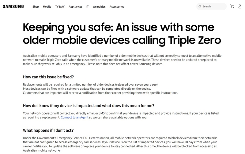 삼성전자도 웹사이트를 통해 일부 구형 모바일 기기가 유사시 000 긴급통화에 제대로 연결되지 않는 것을 발견했다고 공지했습니다.