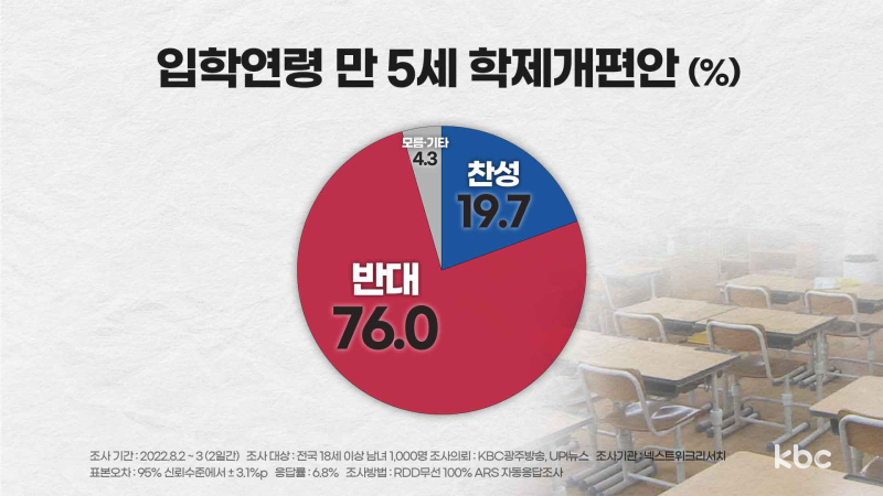 KBC광주방송과 UPI뉴스가 여론조사전문기관 넥스트위크리서치에 의뢰해 지난 2~3일 이틀간 8월 1주차 정기 조사를 실시한 결과, 초등학교 입학연령을 만 6세에서 만 5세로 낮추는 학제개편안에 대해 부정평가가 긍정평가에 비해 압도적이었습니다.