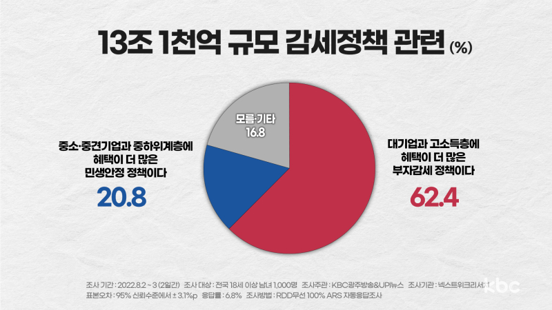 정부가 지난달 21일 정부가 발표한 감세정책에 대해서는 '대기업과 고소득층에 유리한 부자감세'라는 평가가 62.4%를 차지했습니다.