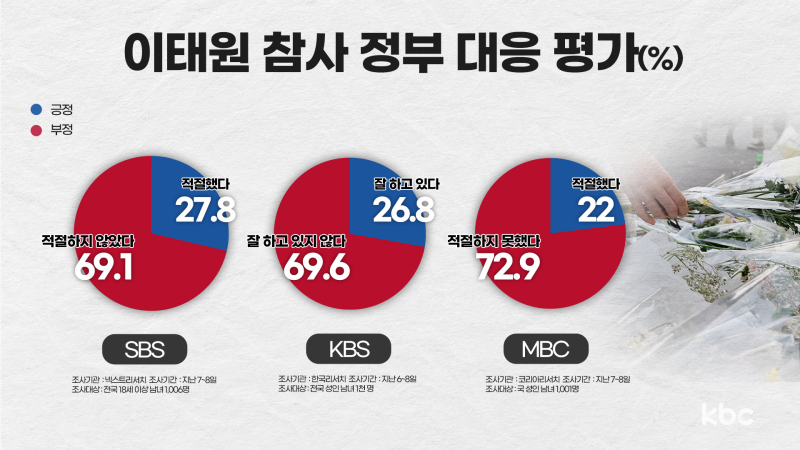 이태원 참사에 대한 정부 대응을 묻는 질문에는 3사 조사 모두 부정 평가가 긍정 평가보다 두 배 이상 많았습니다.