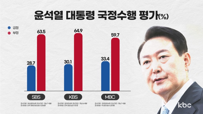 KBS가 한국리서치에 의뢰해 지난 6일부터 8일까지 전국 성인 남녀 1천 명을 대상으로 윤 대통령의 국정운영 평가에 대해 조사(표본오차 95% 신뢰수준 ±3.1%포인트)한 결과 응답자의 64.9%가 '잘못하고 있다'고 답했습니다.