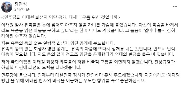 정진석 위원장은 오늘(15일) 자신의 SNS에 "민주당의 이태원 희생자 명단 공개, 대체 누구를 위한 것인가"라는 제목의 글을 올렸습니다.