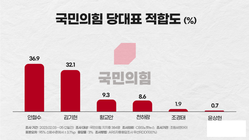 조원씨앤아이가 CBS노컷뉴스 의뢰로 지난 3일부터 5일까지, 국민의힘 지지층 384명을 대상으로 국민의힘 차기 당 대표 적합도를 조사한 결과 안철수 후보가 36.9%, 김기현 후보가 32.1%로 집계됐습니다.