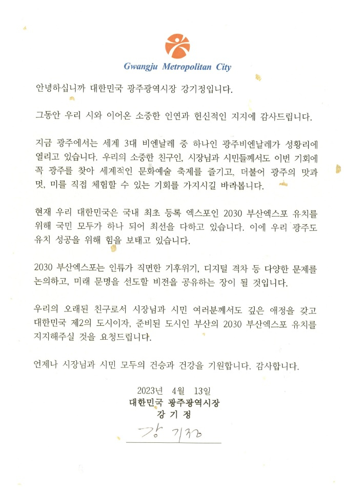강기정 광주시장은 최근 해외 자매·우호도시와 광주비엔날레 참여 국가 등 14개국, 23개 도시에 부산 엑스포 유치를 지지해 줄 것을 요청하는 서한문을 발송했습니다.
