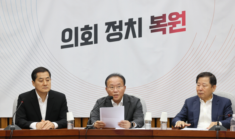 이철규 사무총장은 4일 국회에서 열린 원내대책회의에서 "김 위원장이 노인 비하 발언을 내뱉은 지 나흘 만에 대한노인회를 찾아가 영혼 없는 사과를 했다"며 "진정성은 눈곱만큼도 없던 김 위원장과 표심을 지키려는 민주당의 겉과 속이 다른 '거짓 사과쇼'였다"고 질타했습니다.