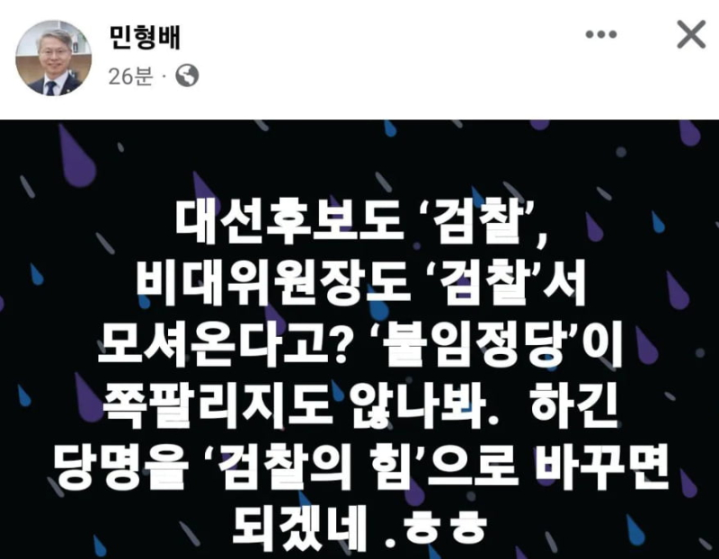 민 의원은 20일 오전 자신의 페이스북에 "대선후보도 '검찰', 비대위원장도 '검찰'서 모셔온다고? '불임정당'이 쪽팔리지도 않나 봐. 하긴 당명을 '검찰의 힘'으로 바꾸면 되겠네. ㅎㅎ"라고 적었습니다.