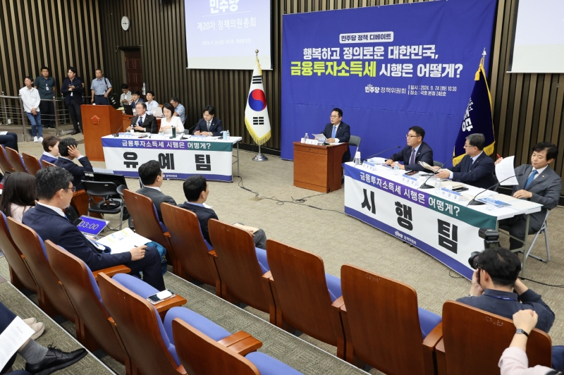 더불어민주당이 4일 국회에서 의원총회를 열고 금융투자소득세를 예정대로 내년 시행할지 혹은 유예·폐지할지를 결정합니다.