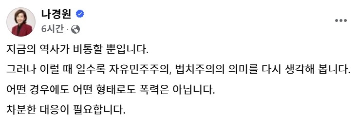 나경원 의원은 자신의 SNS에 "지금의 역사가 비통할 뿐"이라며 "이럴 때일수록 자유민주주의, 법치주의의 의미를 다시 생각해 본다. 어떤 경우에도 어떤 형태로도 폭력은 아니다"라고 적었습니다.