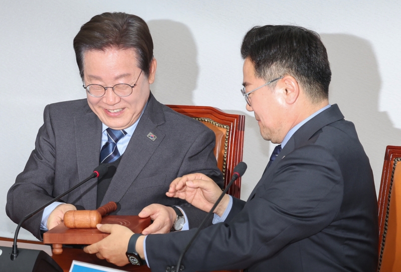 ▲ 더불어민주당 이재명 대표가 9일 서울 여의도 국회에서 열린 최고위원회의에서 사퇴 의사를 밝힌 뒤 권한대행을 맡을 박찬대 원내대표에게 의사봉을 넘기고 있다 [연합뉴스]