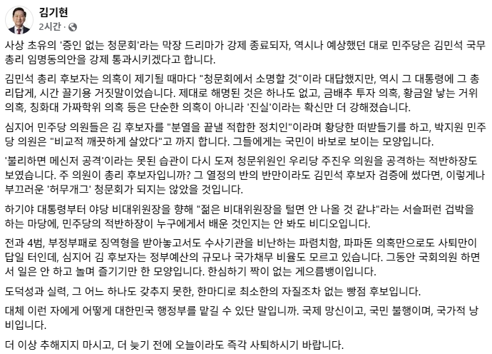 김 의원은 "김 후보자는 의혹이 제기될 때마다 '청문회에서 소명하겠다'고 했지만, 결국 그 대통령에 그 총리답게 시간 끌기용 거짓말에 불과했다"며 "도덕성과 실력, 자질 중 어느 것도 갖추지 못한 빵점 후보"라고 주장했습니다.