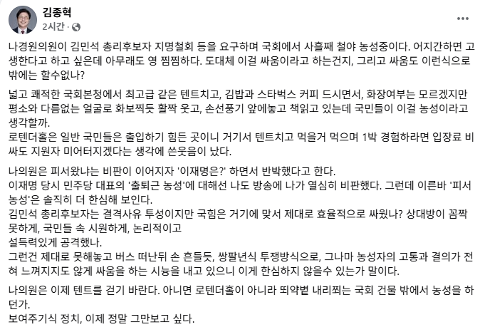 또 "나 의원은 이제 텐트를 걷길 바란다. 아니면 로텐더홀이 아니라 뙤약볕 내리쬐는 국회 건물 밖에서 농성하든가. 보여주기식 정치, 이제 정말 그만 보고 싶다"고 말했습니다.