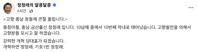 그는 이날 자신의 페이스북에 "충남 금산 출신, '충청의 아들' 정청래가 고향 발전을 위해 고향 분들을 모시고 잘하겠다"면서 지역 당원들에게 큰절하는 사진을 게재하면서 '지역 연고'를 부각하기도 했습니다.