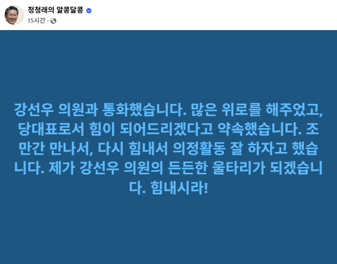 정 대표는 "(강 의원에게) 많은 위로를 해주었고, 당 대표로서 힘이 돼드리겠다고 약속했다"며 "조만간 만나고, 다시 힘내서 의정 활동을 잘하자고 했다"고 적었습니다.