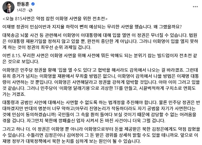 국민의힘 한동훈 전 대표가 이재명 대통령의 광복절 특별 사면에 대해 "이화영 사면을 위해 사전에 뭐든 막 해도 되는 분위기 잡는 빌드업이자 전초전 같은 것"이라고 평가했습니다.