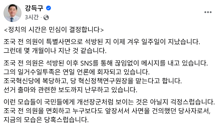 더불어민주당 강득구 의원이 조국 전 조국혁신당 대표의 특별사면 이후 행보에 대해 아쉬움을 드러냈습니다.
