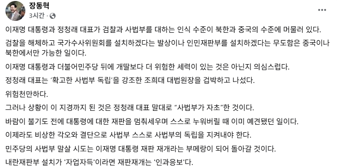 장 대표는 13일 페이스북에서 정청래 민주당 대표가 사법개혁을 '자업자득'이라 표현한 것을 겨냥해 "내란재판부 설치가 자업자득이라면 대통령 재판 재개는 인과응보"라며 "민주당의 사법부 인식은 북한·중국 수준"이라고 주장했습니다.