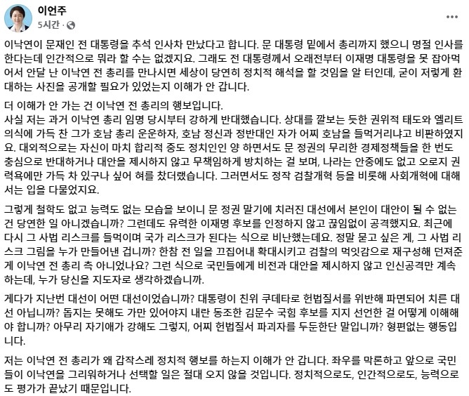 더불어민주당 이언주 최고위원이 14일 문재인 전 대통령을 예방한 이낙연 전 국무총리를 강하게 비판했습니다.