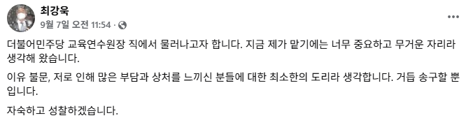 이에 민주당 지도부는 진상 조사를 지시했고, 최 전 원장은 지난 4일 페이스북을 통해 교육연수원장직 사퇴를 선언하며 "이유 불문, 저로 인해 부담과 상처를 느끼신 분들에게 최소한의 도리를 하고자 한다"고 밝혔습니다.