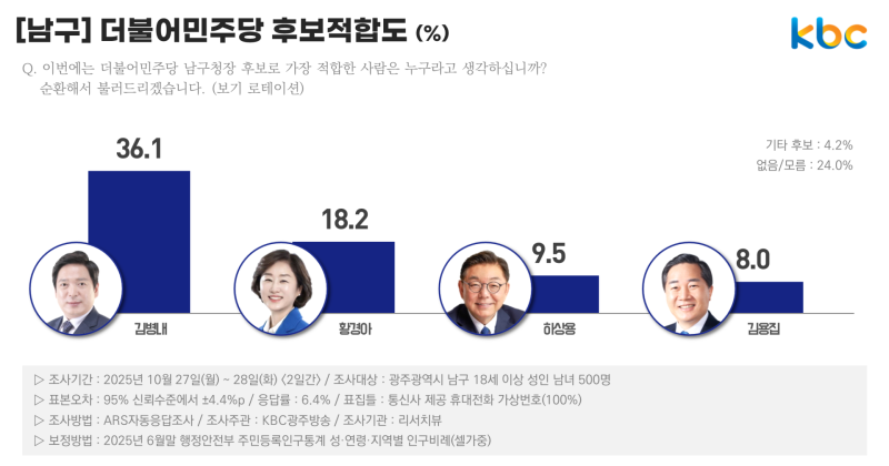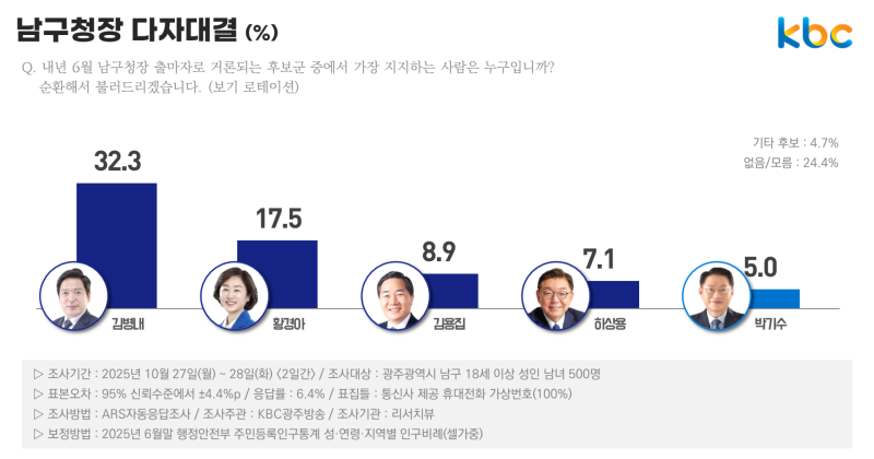 황경아 전 남구의회 전반기 의장은 17.5%, 김용집 전 광주시의회 의장은 8.9%, 하상용 전 빅마트 대표 7.1%, 박기수 현 조국혁신당 남구지역위원장은 5.0%를 기록했습니다.