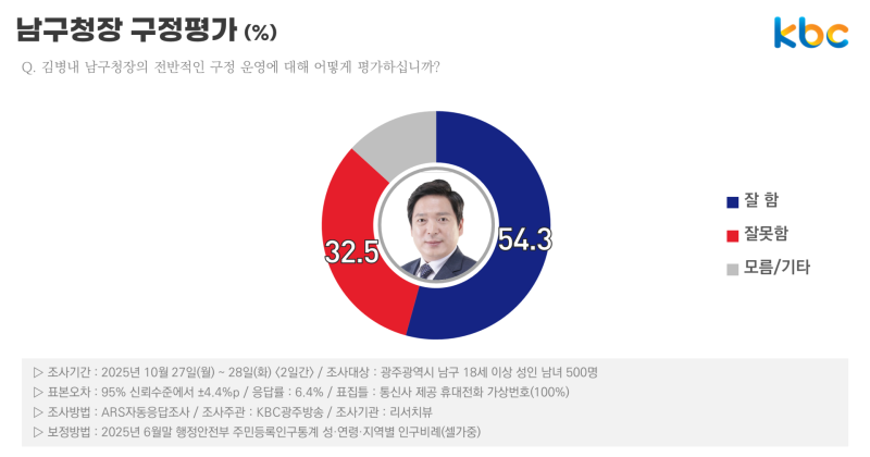 KBC 광주방송이 여론조사 전문기관 리서치뷰에 의뢰해 지난 27일과 28일 이틀간 광주광역시 남구 거주 만 18세 이상 유권자 500명을 대상으로 지지 후보를 조사한 결과, 김병내 남구청장이 32.3%의 지지를 기록했습니다.