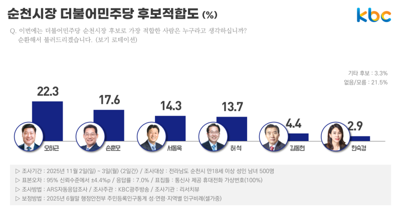 KBC 광주방송이 여론조사 전문기관 리서치뷰에 의뢰해 지난 2~3일 이틀간 순천에 거주하는 만 18살 이상 유권자 500명을 대상으로 여론조사를 실시한 결과 노관규 시장이 21.7%로 가장 높은 지지율을 보였습니다.