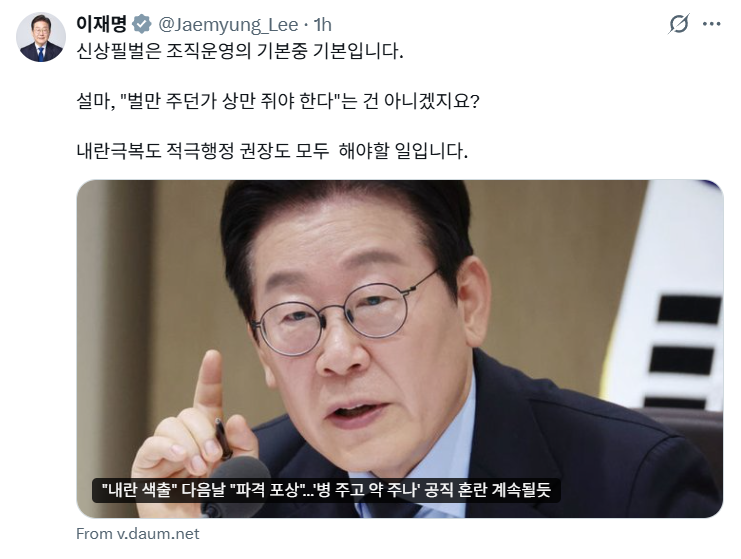 이 대통령은 16일 SNS 엑스(X·옛 트위터)에 글을 올려 "신상필벌은 조직 운영의 기본 중 기본"이라며 "내란 극복도, 적극행정 권장도 모두 해야 할 일"이라고 강조했습니다.