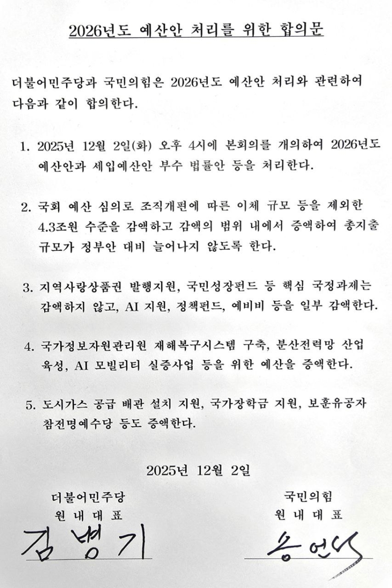 더불어민주당과 국민의힘이 내년도 예산안에 합의했습니다.