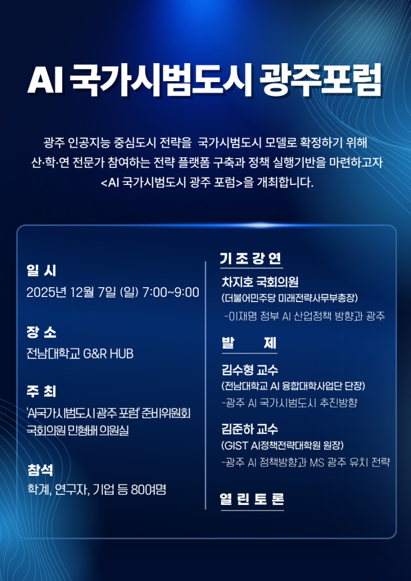 'AI 국가시범도시 광주 포럼 준비위원회'와 국회의원 민형배 의원실이 주최하는 이번 포럼에는 800여 명의 학계, 연구자, 기업 관계자들이 참석할 예정입니다.