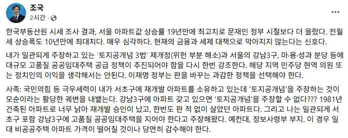조국 대표는 17일 자신의 페이스북을 통해 "한국부동산원 시세 조사 결과, 서울 아파트값 상승률이 문재인 정부 시절보다 더 올랐다. 전월세 상승폭도 10년만에 최대치"라고 밝혔습니다.