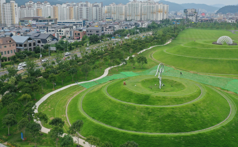 순천 동천저류지숲은 도로와 연접한 대규모 택지지구와 분리하기 위해 2021년부터 2023년까지 38억 원을 들여 조성됐습니다.