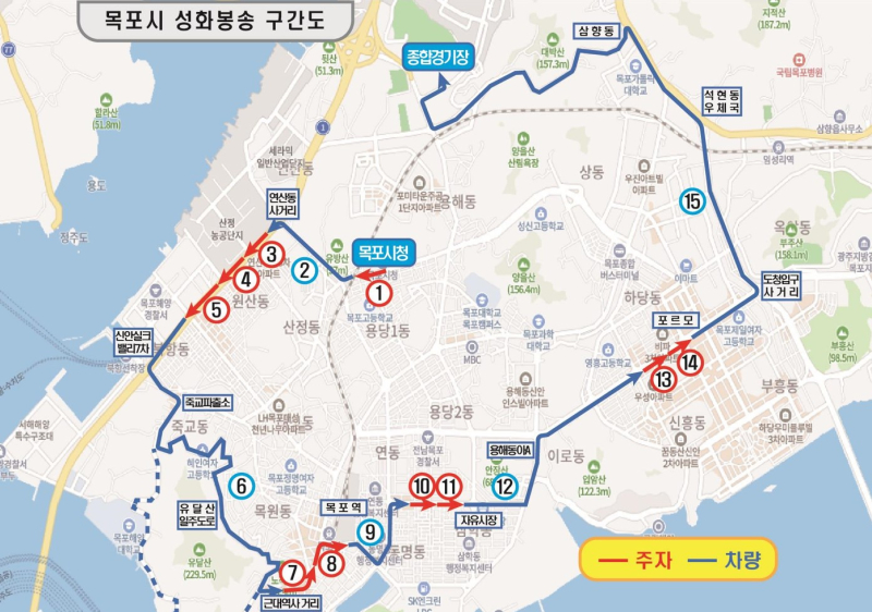 이어 봉송 주자가 지나가는 근대역사1관 사거리에서 청소년문화센터와 호텔락희 사거리 ~ 삼학동 미추리빵 본점 ~자유시장 인근 ~ 수협 하당지점 ~신한은행 1개 차로씩 통제될 예정입니다.