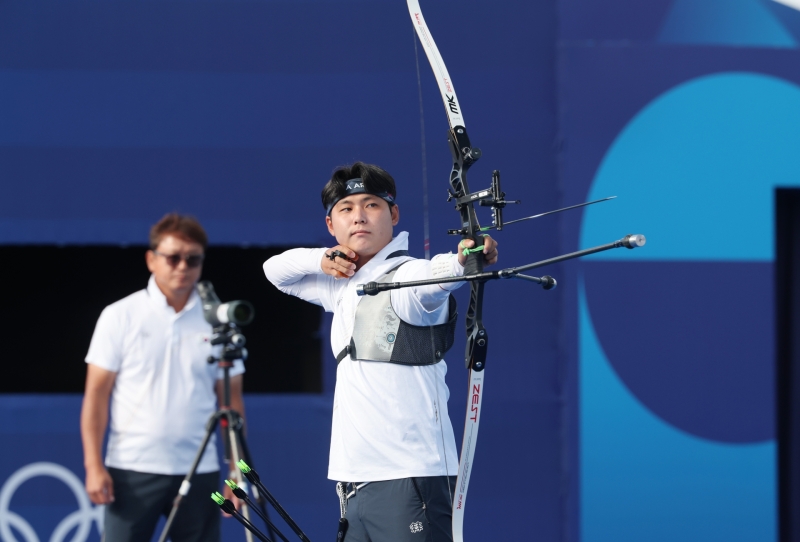 남자 양궁 개인전 8강전에서 대한민국 이우석 선수가 이탈리아 네스폴리에게 극적 역전 승리해 준결승에 진출했습니다.